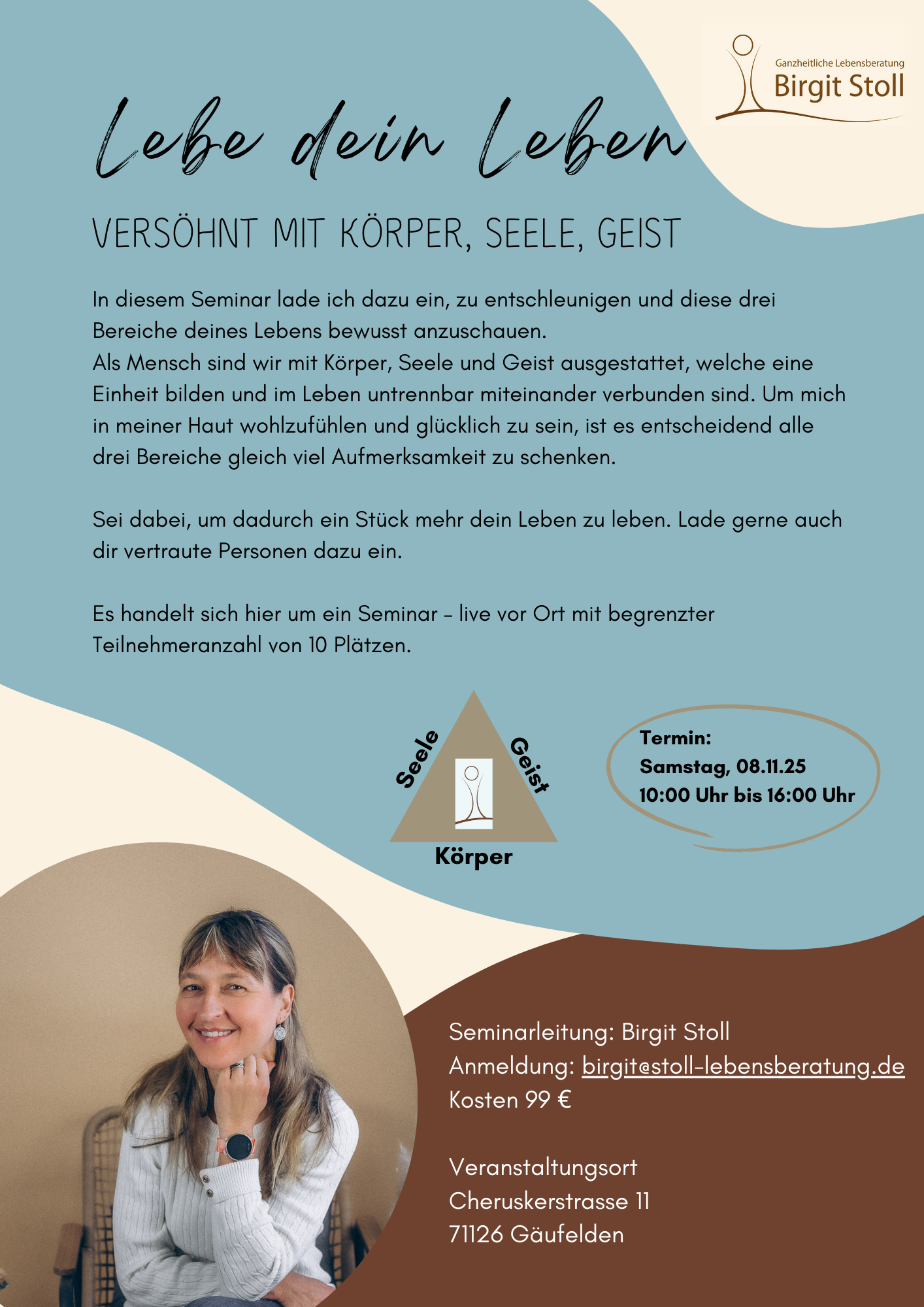 Veränderung geschieht nicht über Nacht – sie ist ein Prozess. Deshalb begleite ich Sie nicht nur in der Stoll-Lebensberatung, sondern biete ergänzend Seminare an, die Sie gezielt dabei unterstützen sich selbst besser zu verstehen, die innere Balance zu stärken und neue Perspektiven zu entwickeln.